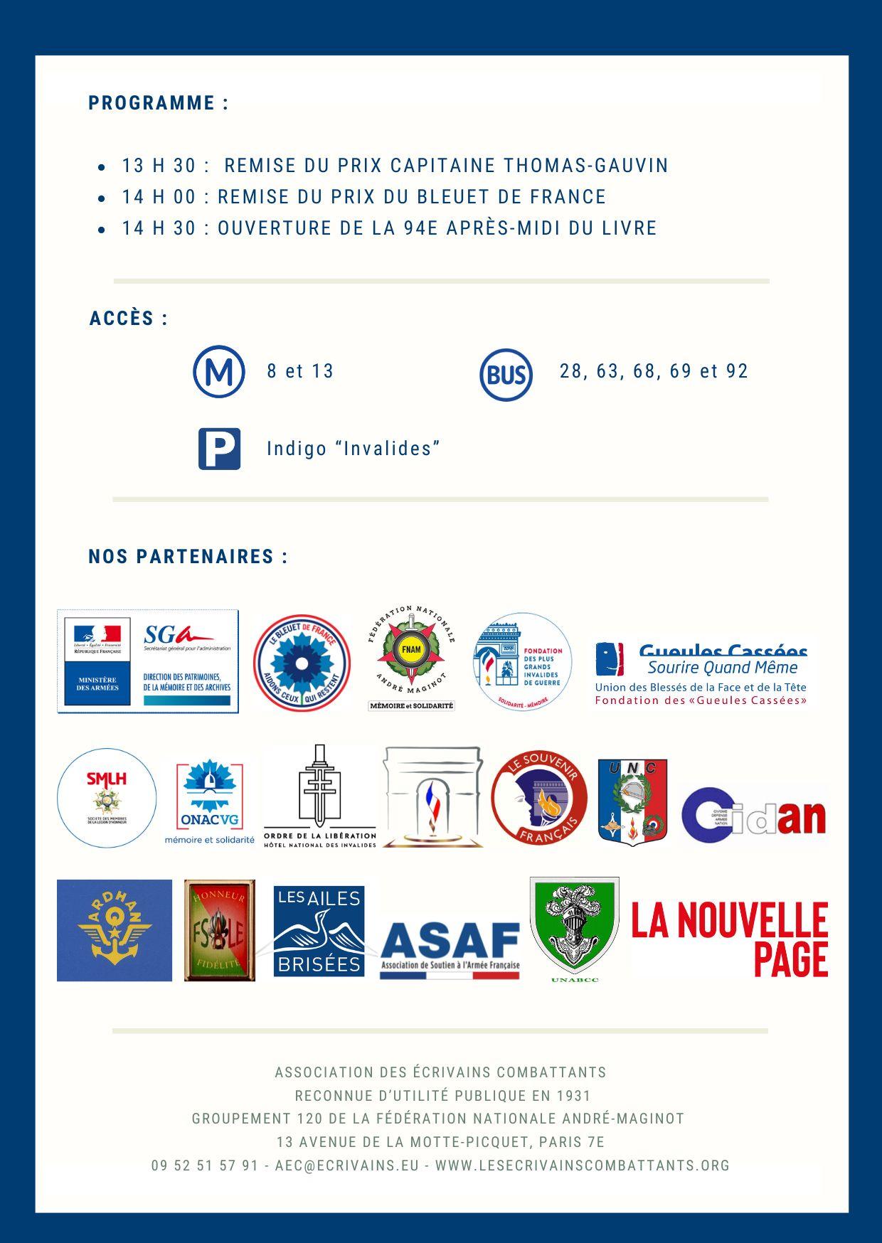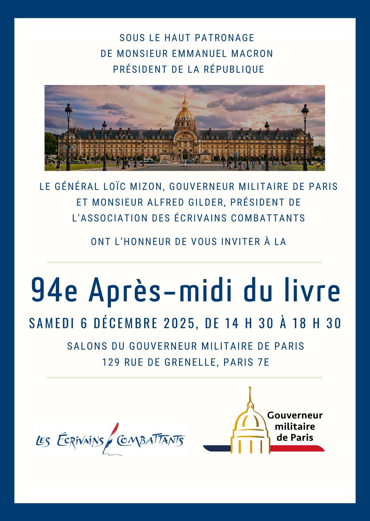 L'Association des Ecrivains Combattants organise son 94ème Après-midi du Livre samedi 6 décembre 2025, de 14h30 à 18h30, dans les Salons du gouverneur militaire de Paris, à l'Hôtel national des Invalides.
